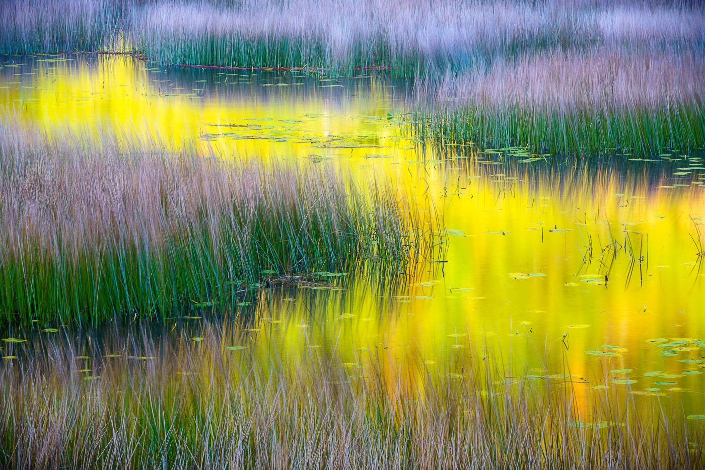Another effective approach to capturing stunning fall color is to photograph reflections. I usually like to find and photograph reflections when it’s bright and sunny and I might not otherwise find something productive to shoot because the light might be too harsh. Look for the best reflections around bodies of water or portions of streams that are in shade opposite colorful trees that are being directly illuminated by the sun. When shooting reflections on the surface of moving water, like along a stream, try varying your shutter speed to reveal differing amounts of detail or motion blur. For reflections on a rippled surface of a pond or lake I like a shutter speed of between 1/60 and 1/160 of a second to capture the ripples with a fair amount of sharpness and detail while also creating a bit of an abstract or impressionist vibe. Experimentation is key and every image is going to be slightly different so take a lot of frames to find one that is the most compositionally pleasing.